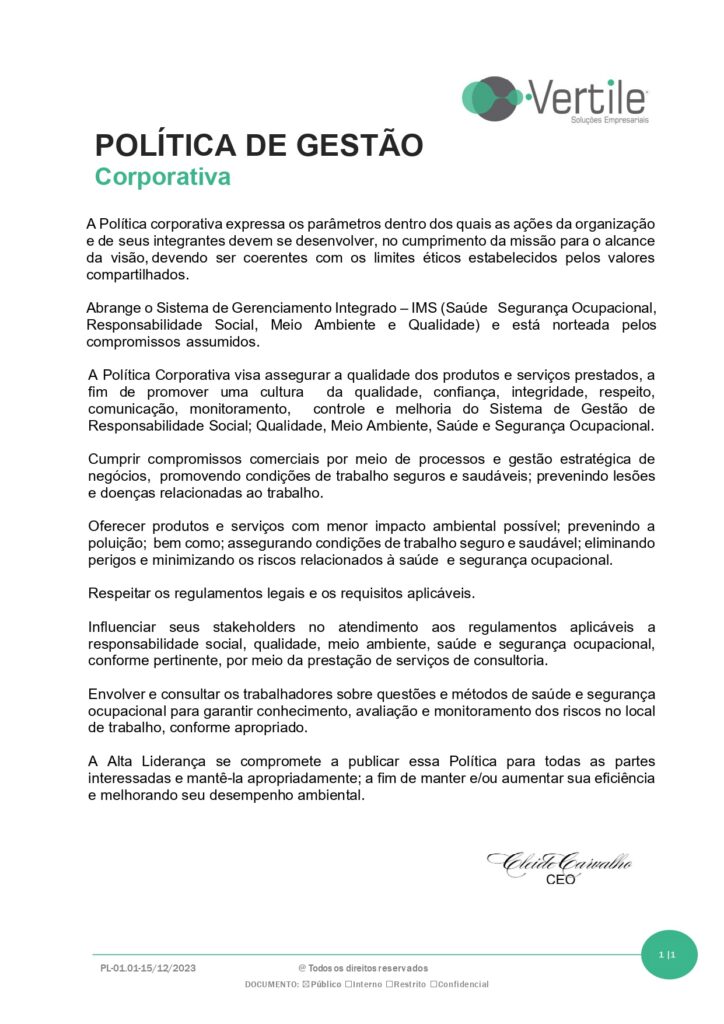 Mais do que um documento formal, ela representa o posicionamento institucional diante de temas estratégicos como ética, qualidade, segurança, conformidade e gestão de riscos.